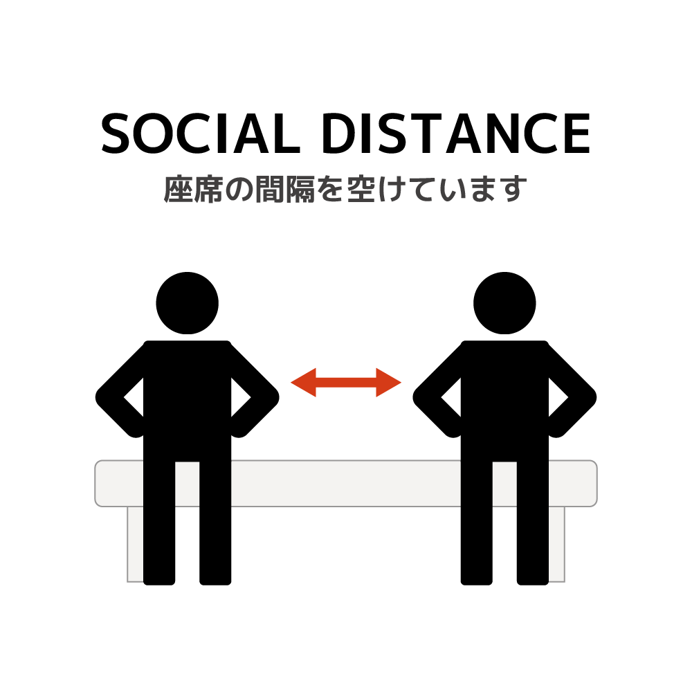席と席の間を間隔を空けて座ることを知らせるイラストです。ソーシャルディスタンスの実施をする際にご利用いかがですか。